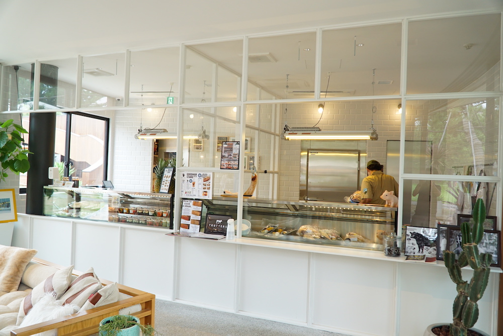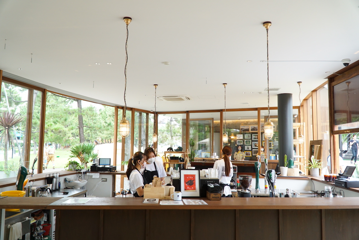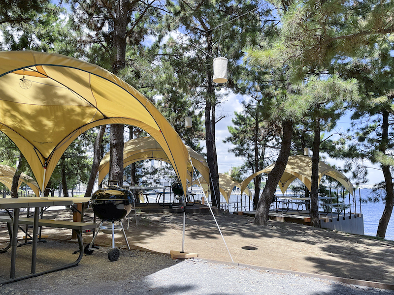 最後がこちらの「ファイヤーフォレスト」エリア。松の木が生い茂る森の中で、本格キャンプ気分が味わえるエリアです。木々が立つ先には青く輝く海がちらり。まるで山の中でキャンプをしているかのよう。利用時間は12〜16時、18〜22時。利用可能人数は4〜16人です。「ファイヤーフォレスト」内にはカフェスタンド「GOODMAN STAND and DAUGHTER」(グッドマンスタンド アンドドーター)も併設。ドリンクやカフェメニューが楽しめます。