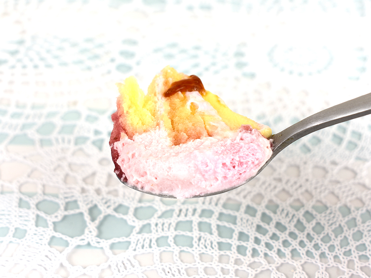 プリンの下にはいちごソース、スポンジケーキ、いちごムースが重なっています。薄いピンク色のいちごムースはシュワッと溶ける不思議な舌触りで、口に入れるとあっという間になくなってしまいます。口の中に広がるミルクの優しい甘さがたまりません。個人的にお気に入りなのがしっとり食感のスポンジケーキ。シロップの染みたスポンジはなんともクセになる味わいです。