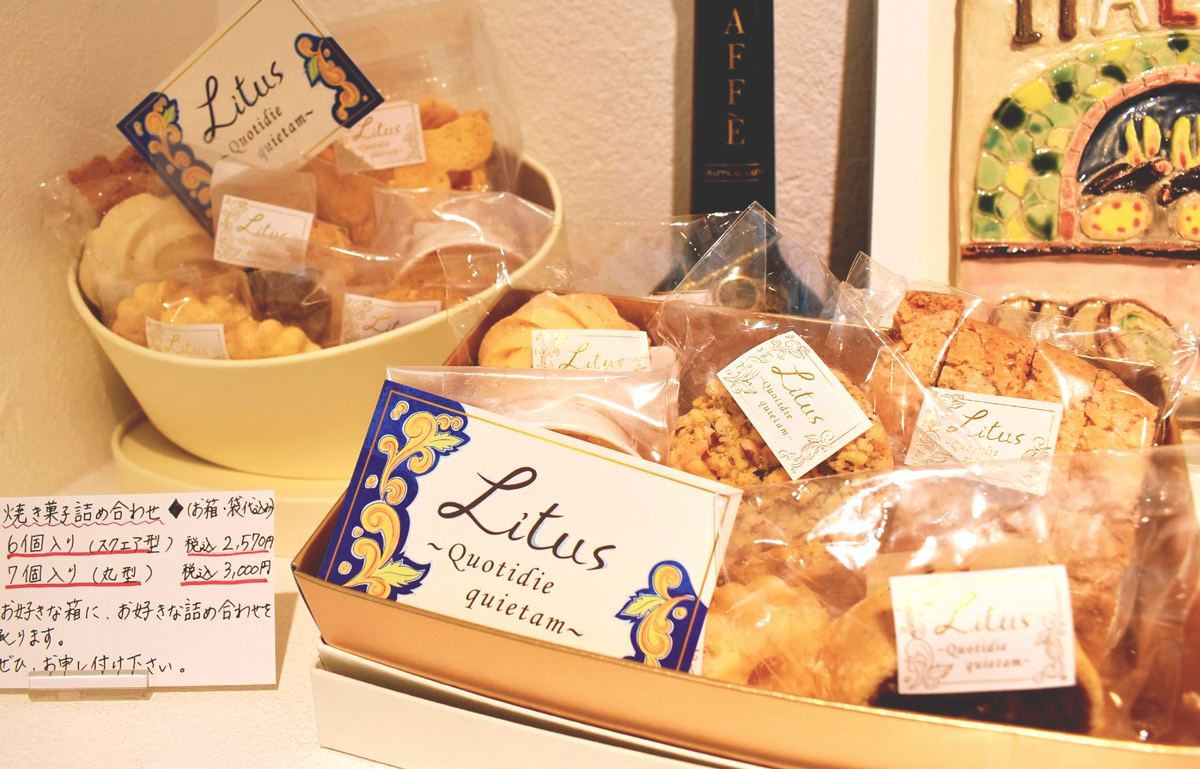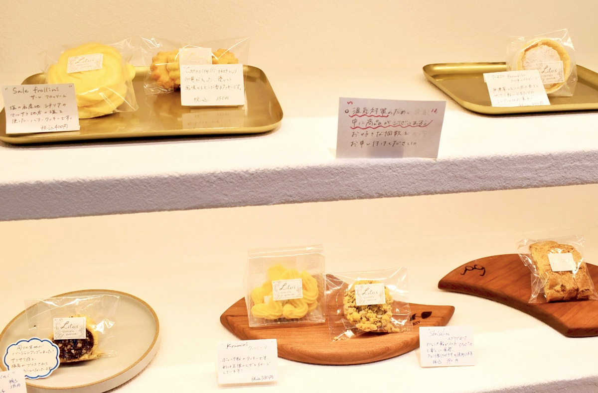 店内の一画には、日持ちする焼菓子のコーナーも。イタリアの定番ビスケット「カントゥッチ(ビスコッティ)」400円をはじめ、王様のヒゲをイメージしたポレンタ粉(トウモロコシ粉)のクッキー「クルミーリ」380円や、ナッツ、ハチミツ、ドライフルーツがたっぷり詰まったシチリアのクリスマス菓子「ブッチェラート」390円など、多彩な品揃えです。
