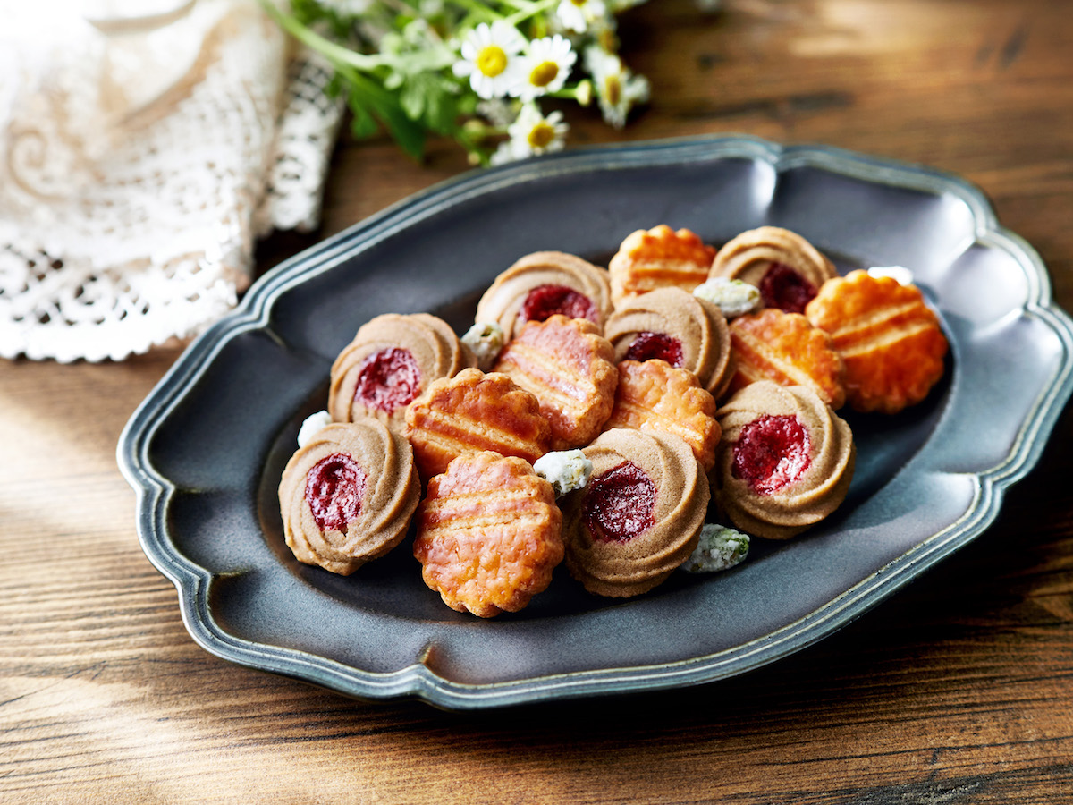缶の中には発酵バターの風味とさわやかなオレンジの香りが広がる「サブレ・ナンテ〈オランジェ〉」と、アールグレイ香る繊細な生地に苺のコンフィチュールを絞って焼き上げた「紅茶・フレーズ」、糖衣がけした「プラリーヌ・オ・ピスターシュ」が詰め込まれています。ティータイムにぴったりの華やかなおいしさ。缶に詰められたブーケをイメージした上品なクッキー缶は、おみやげにもおすすめですよ。