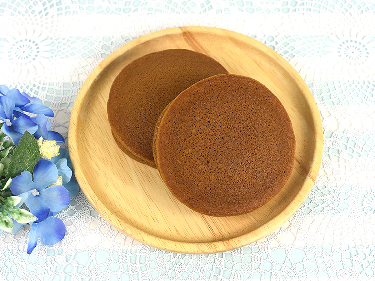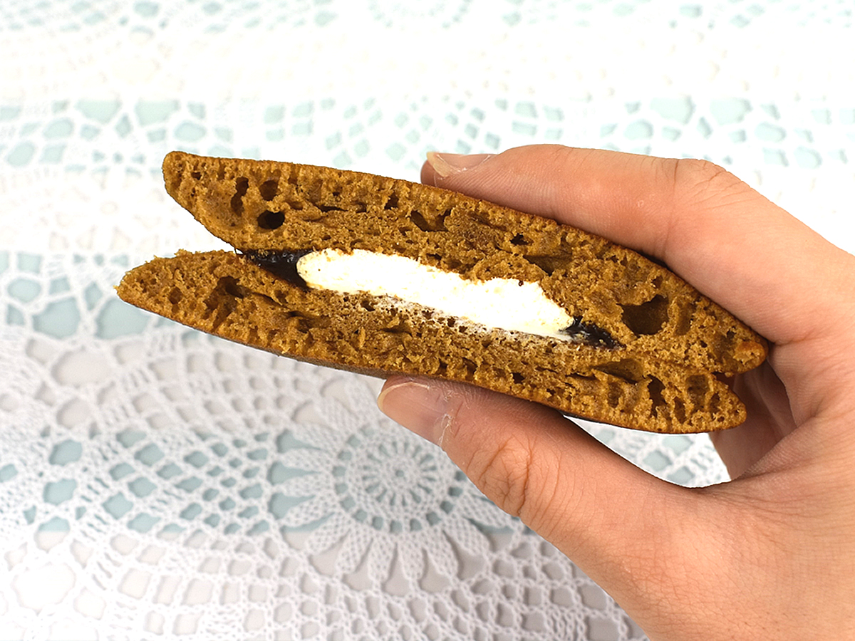 パッケージを開封するとコーヒー色のパンケーキがお目見え。2つ入りのパンケーキは想像以上に分厚く、ずっしりと重量感があります。指が沈むほどふかふかの生地に期待感は高まるばかり。さっそく実食していきましょう!