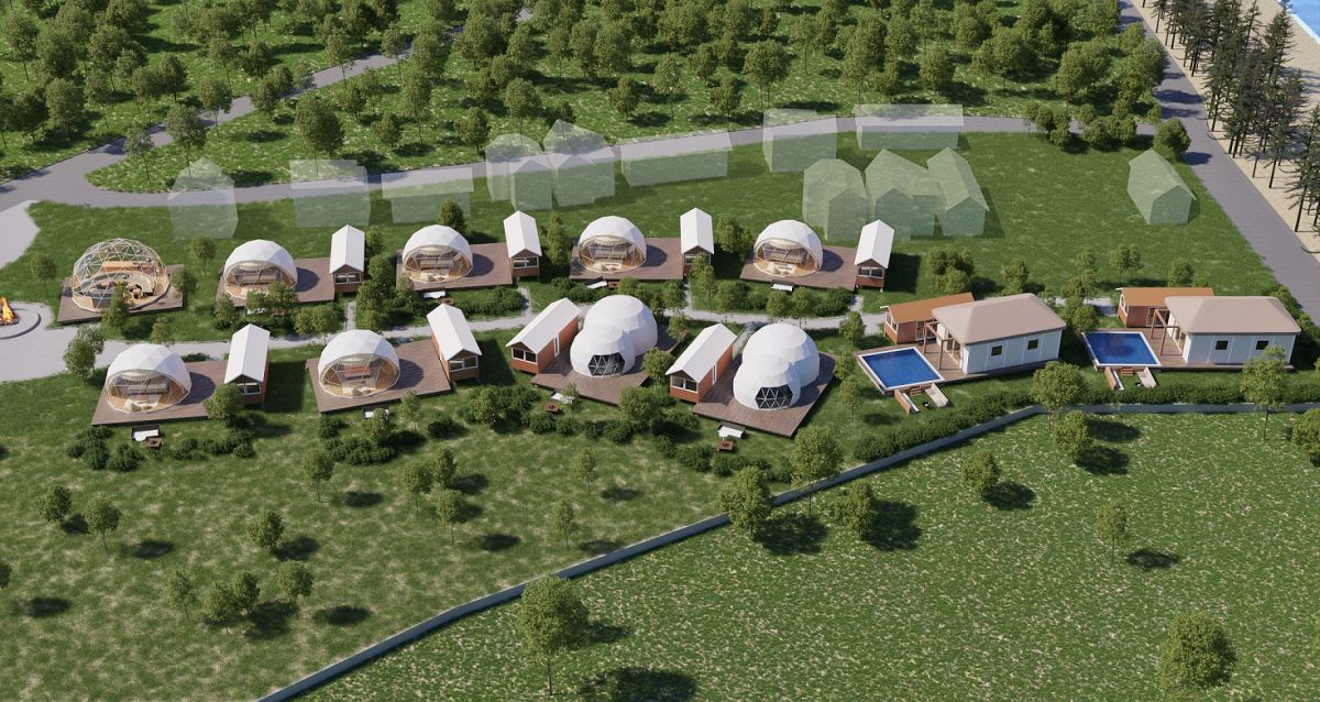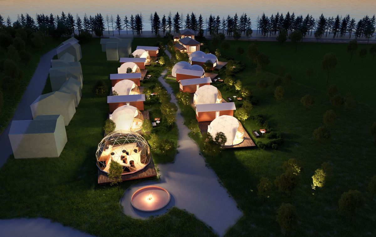 施設には、直径7ⅿのドームテントの「スタンダードドーム」6棟をはじめ、冷暖房を完備した3タイプのグランピングテントが全10棟。