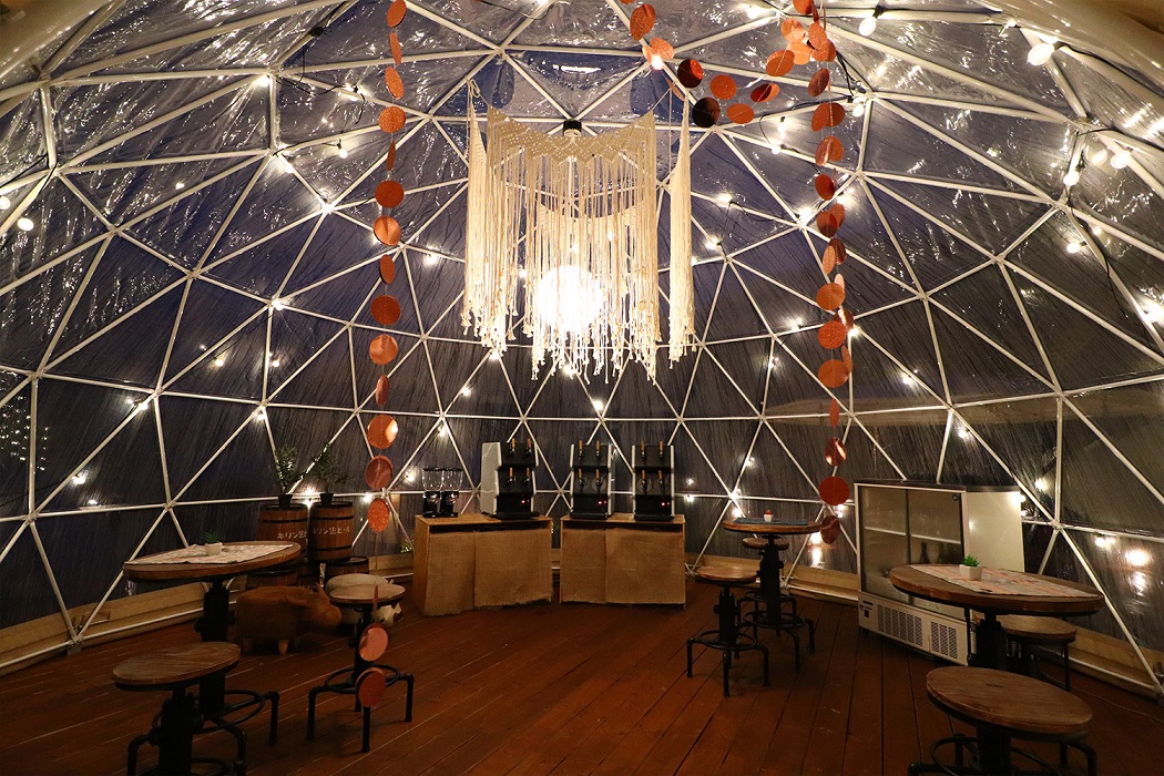 透明ドームは夜になると幻想的に光を放つ、セルフサービスのナイトバーに。18~21時の間ビールとワインが無料で楽しめます。お酒を飲みながらゆったりとした時間が過ごせそうです。