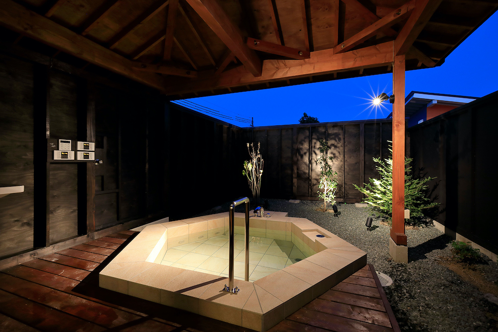 全棟シャワー付きですが、敷地内に天然温泉の貸切風呂もあります。利用は予約制で40分2000円(別途入湯税)。グランピングでアウトドアを楽しんだ後、温泉にゆっくりつかり極上の時間を過ごせば、リラックスできて日ごろの疲れも吹き飛びそうです。