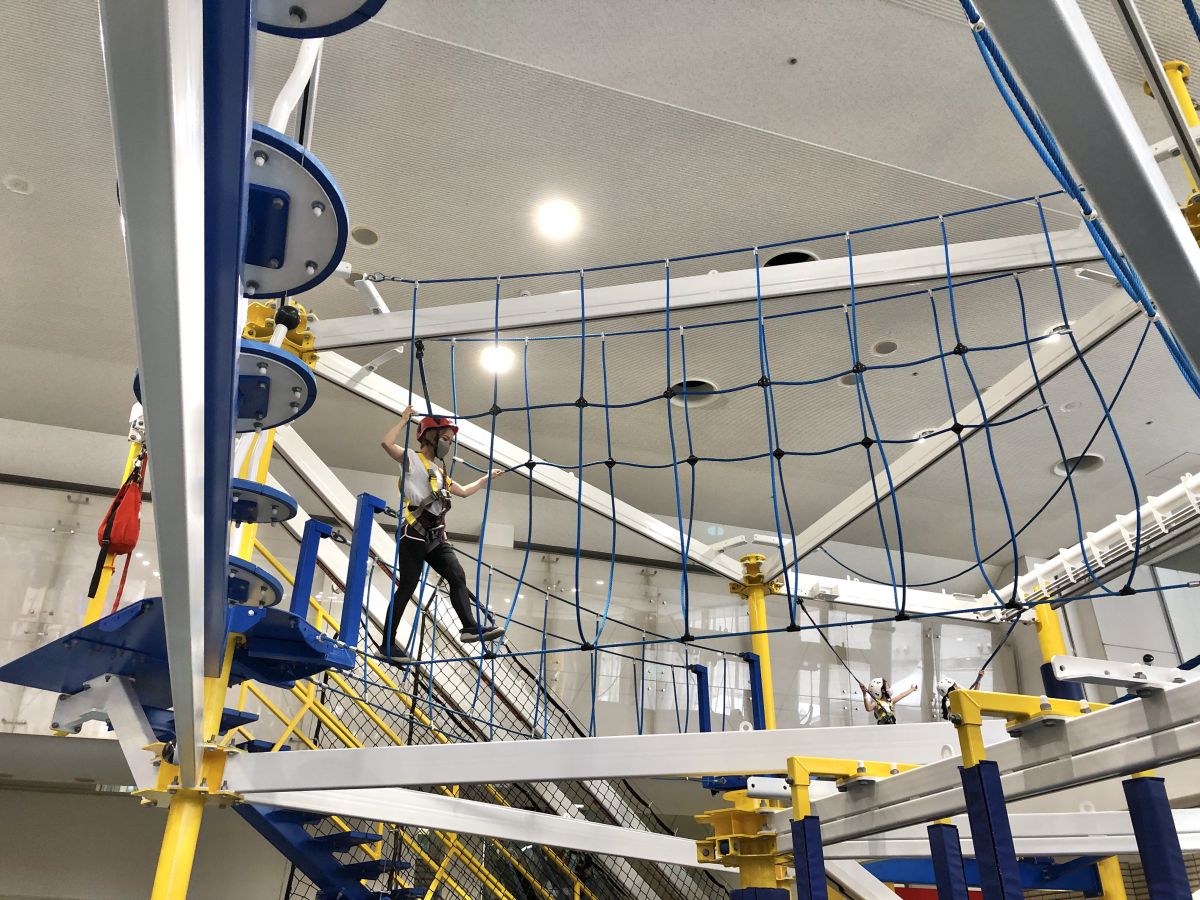トランポリン以外のアクティビティも充実。ヘルメットやハーネスをつけて体験できるのは…? 高さ約3.5mの「ロープウォークエリア」! 全長約111mものロープ上を進んでいくスリリングなアクティビティです。幼いお子さんも安全に楽しめるので、家族で訪れても盛り上がりそう!
