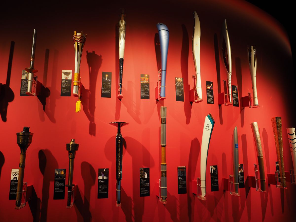 過去の大会で聖火リレーに使われた個性豊かな形のトーチの数々、歴代国内大会のメダルは必見!