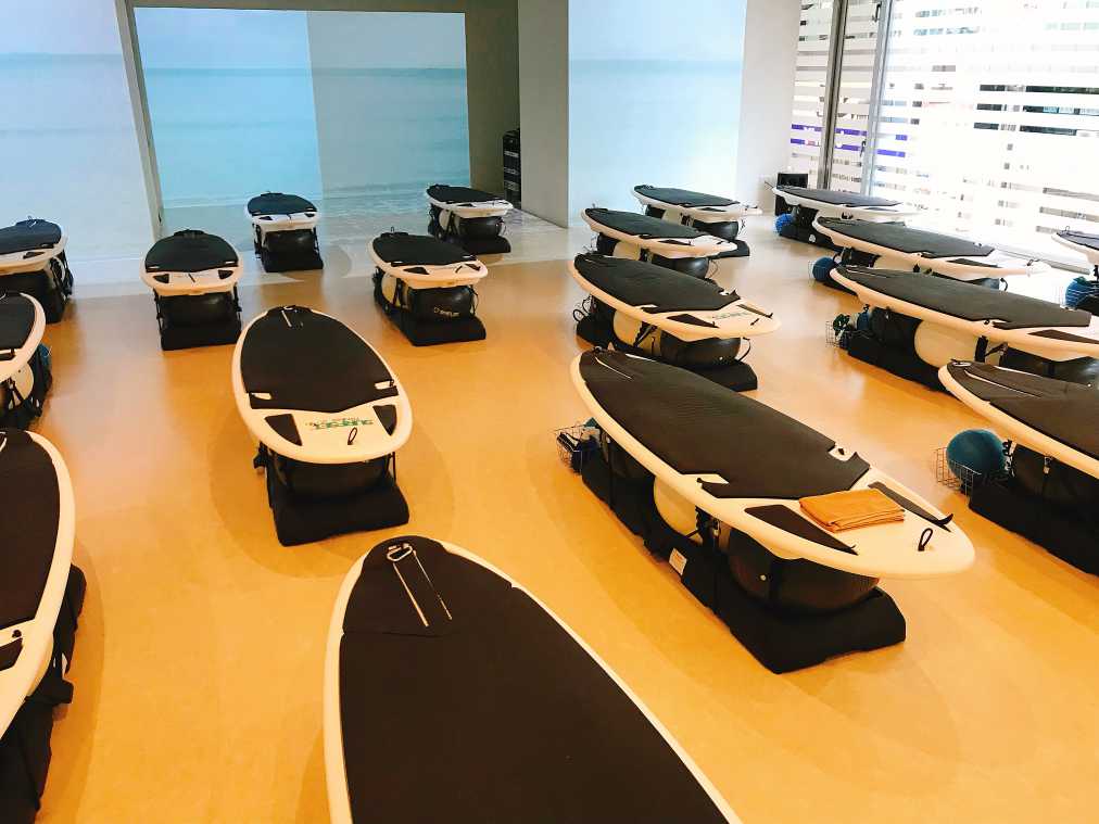 こちらで体験できるのは、サーフボードの下にバランスボールが付いている機器に乗ってトレーニングを行うロサンゼルス発の最新エクササイズ。