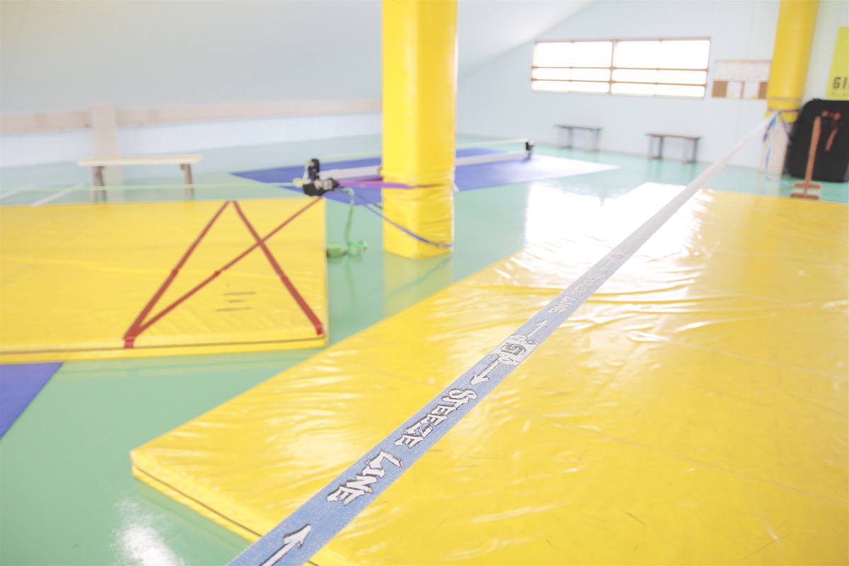 こちらが3階のスラックラインコーナー。高さの異なるスラックラインが3本はられています。幅5cmほどのベルト状のラインは、手で押すだけで沈むほどの伸縮性です。シューズを履く人もいますが、裸足でもOK! 動きやすい服装さえあれば始められる気軽さも嬉しいポイントです。