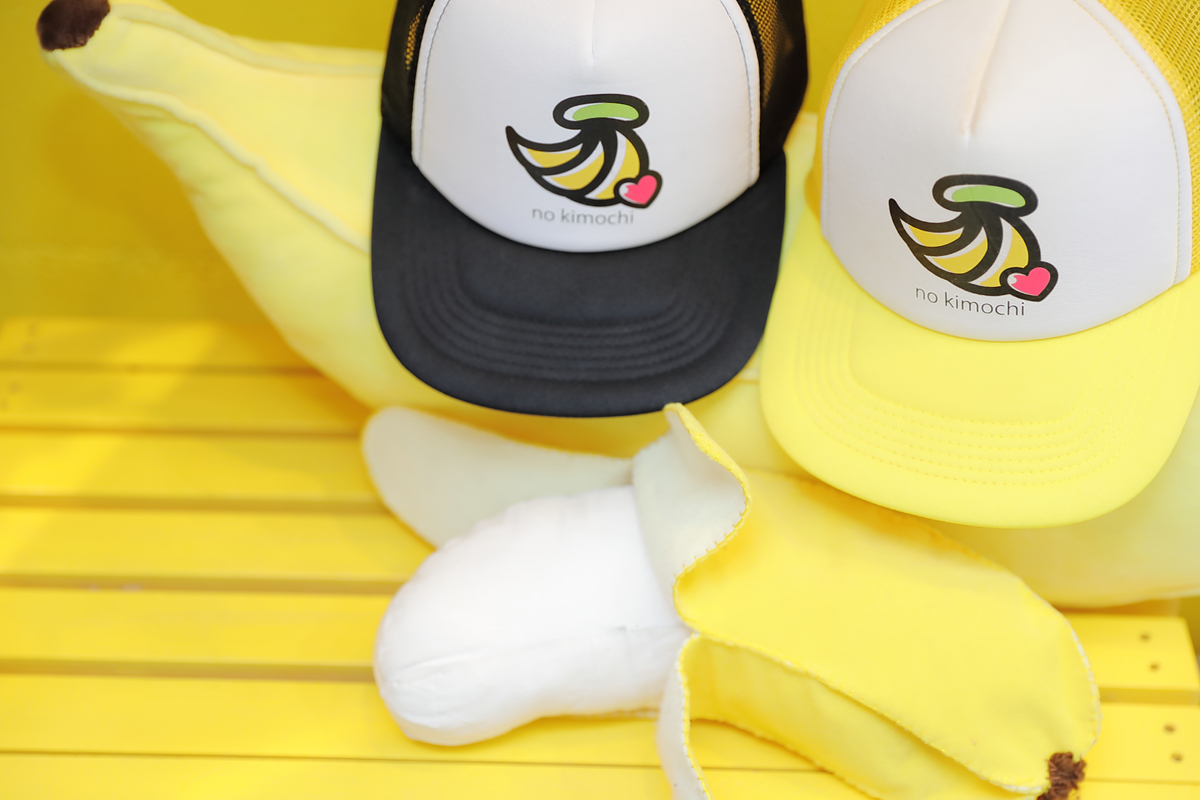 スタッフがかぶっているキャップもかわいい!バナナ柄のキャップや布バッグなどのオリジナルグッズも販売中です。
