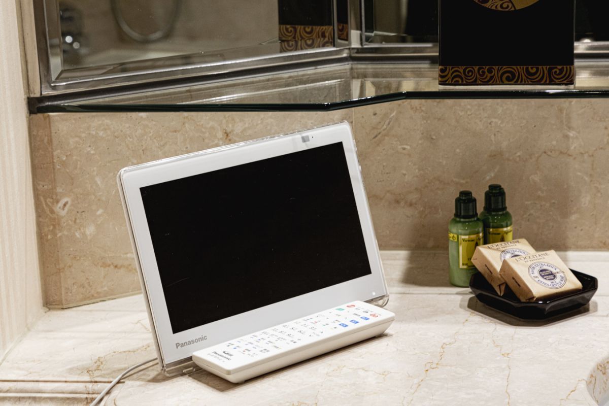 バスルームは広々としたゆったりサイズ。大理石が使われているので優雅な気分に浸れますね。大きなバスタブ、シャワーブース、トイレが別々になったセパレートタイプで機能性も抜群。ポータブルテレビもあるので、テレビを見ながらバスタイムを楽しみましょう。スツールに座ってゆっくりドライヤーをかけたりお化粧をしたりできますよ。