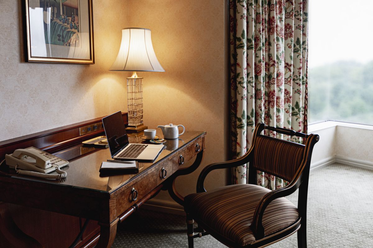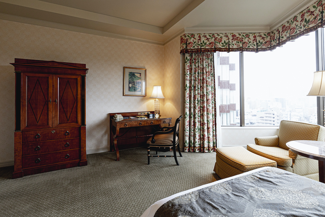 自宅との雰囲気や窓の外の景色が異なると気分が変わって仕事に集中しやすくなるもの。ホテルオープン時から使い続けられているアメリカ・ベーカー社のクラシカルなライティングデスクと美しい庭園が、お仕事空間を非日常なものに演出してくれます。
