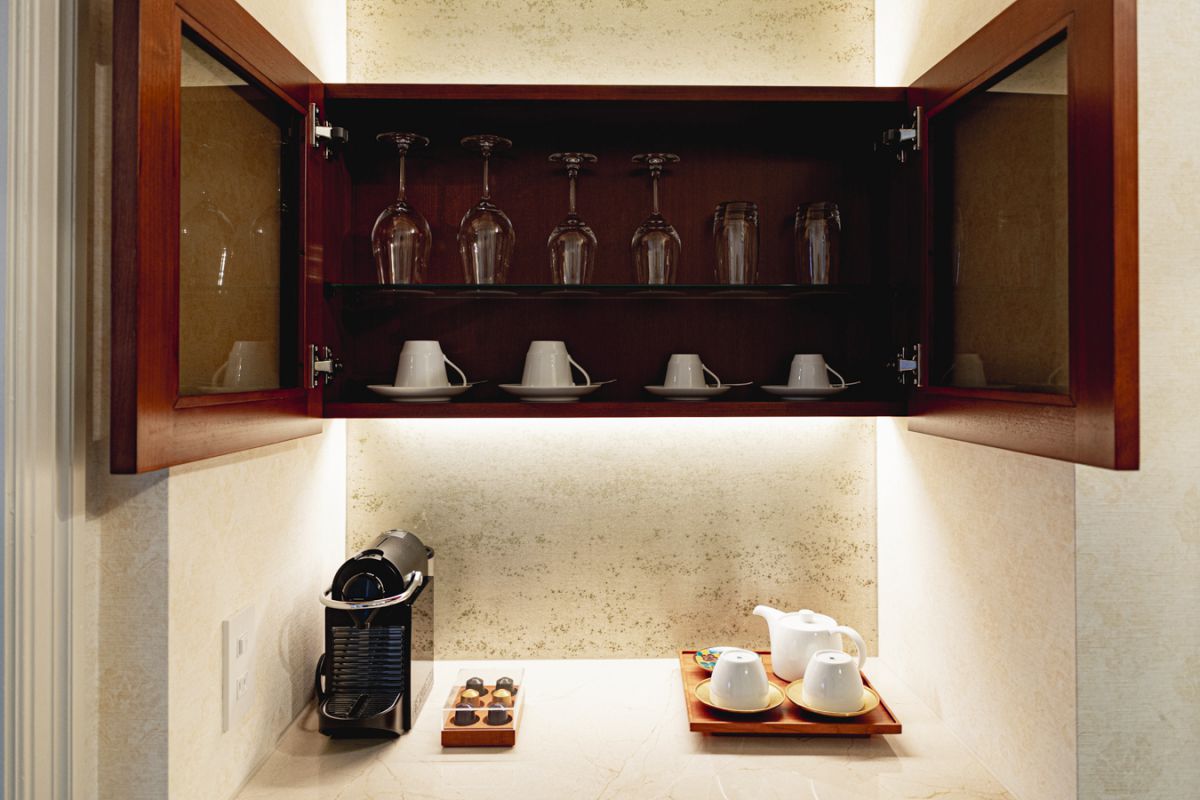 「セレクションズ」では、コーヒーやアルコール類のドリンクも扱っています。客室のプライベートバーにはネスプレッソのコーヒーマシンやお茶があるので、こちらも仕事中、休憩のドリンクに利用してください。
