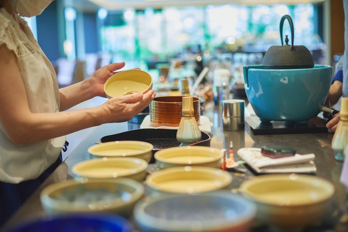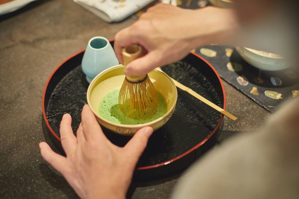 抹茶の粉は「一保堂茶舗(いっぽどうちゃほ)」。教えてもらって、自分で点てます。お抹茶体験を含め、ゲストラウンジでの飲食はすべて無料サービス。
