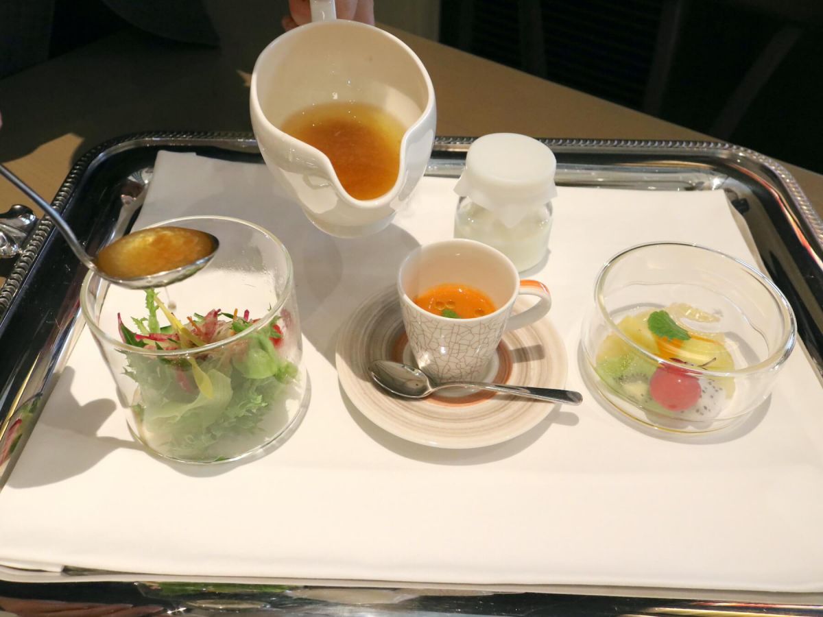 次に、「一口ガスパッチョ」「サラダ」と「カットフルーツの盛り合わせ」。ひと口ずつ何種類ものフルーツが食べられるなんて、ホテルならではの贅沢。
