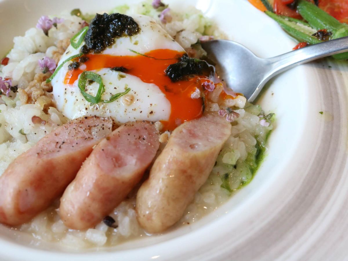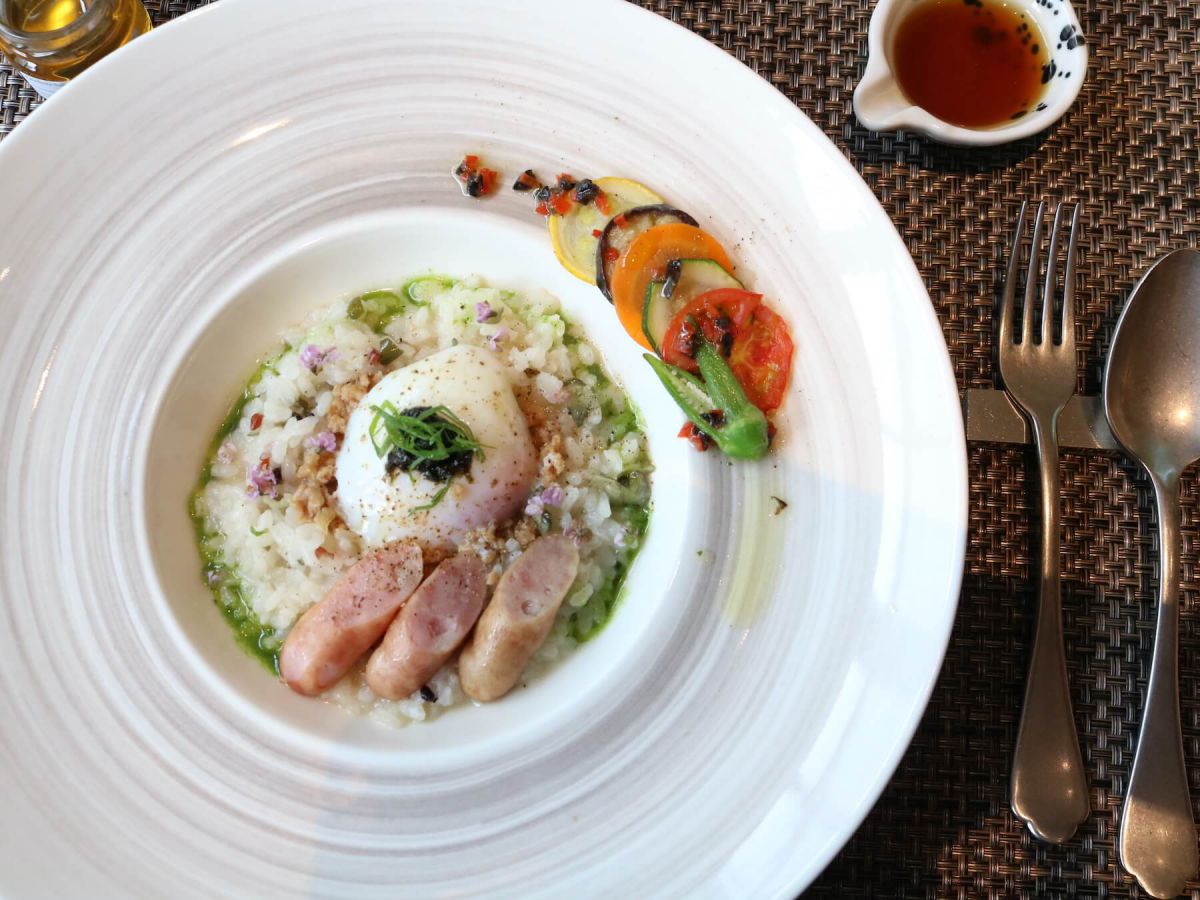 温泉卵のように仕上げられた卵を割ると、濃い黄身がとろり。しば漬けの風味と食感がアクセントのリゾットとからめていただきます。朝に嬉しいやさしい味わい。
