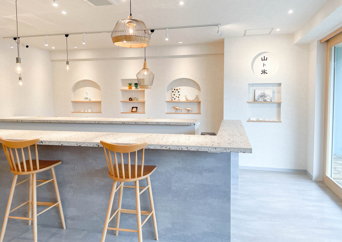 「山ト氷」は、北摂(大阪府北部)に3店舗を構える洋菓子店「シェ・ナカツカ」がプロデュースした新ブランド。「シェ・ナカツカ」はパティシエ・中塚幸宏氏が手掛ける、デザイン性や色彩に富み、躍動感のあるスイーツが数々のコンテストで高い評価を受けている実力店です。モンブランとその本店の隠れ人気メニューであるかき氷を、より豪華にアレンジしたのが「山ト氷」の看板メニュー。明るく洗練された店構えもステキです。