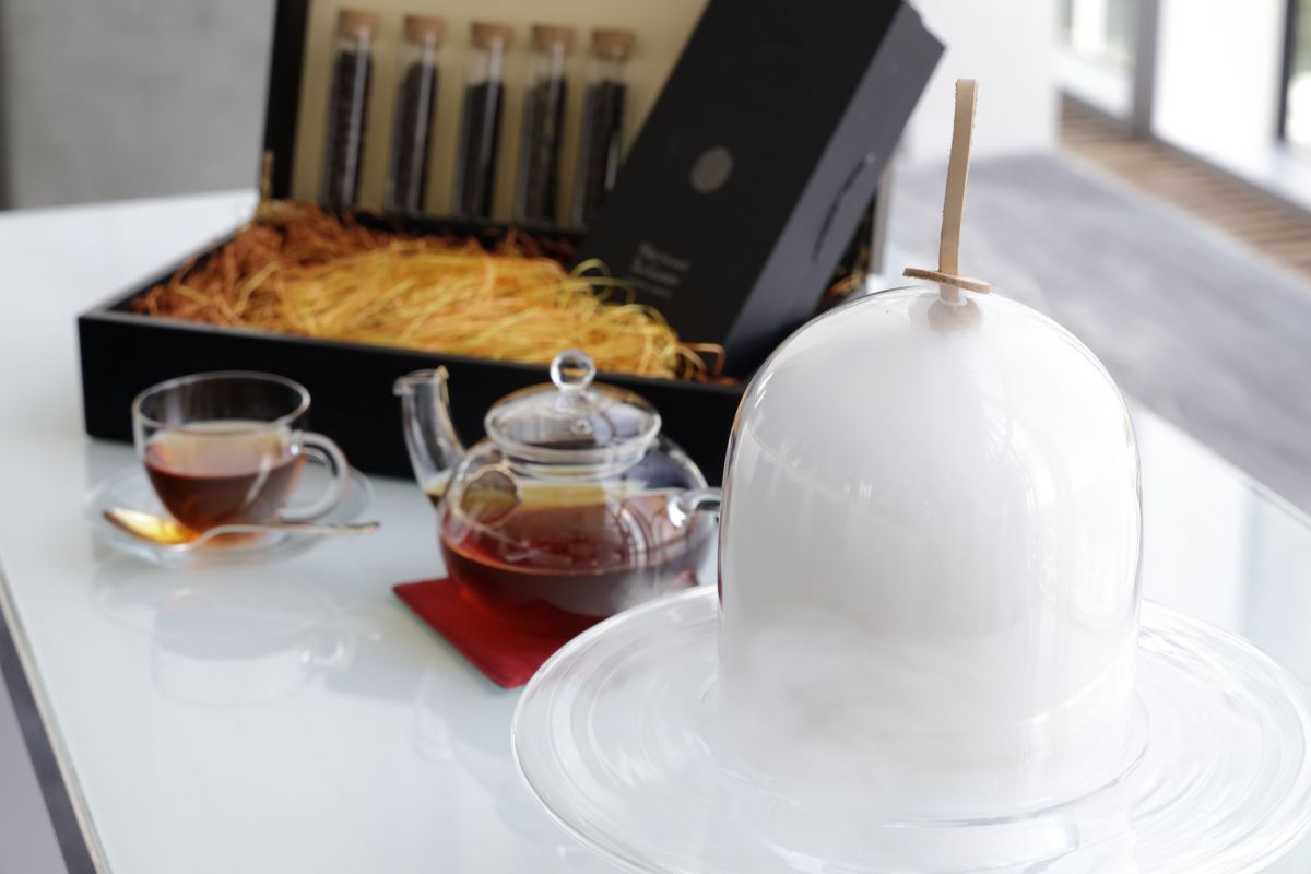 こちらが、「大阪マリオット都ホテル」の秋の人気メニュー・モンブラン。“白い山”をイメージしたドライアイスの演出で登場します。「モンブラン」という名前は、フランスとイタリアの最高峰であるアルプス山脈のモンブランが由来。フランス語で「白い山」を意味するところからインスピレーションを得た演出なのだそう。ガラスの蓋を開けると、絞りたてモンブランが姿を現します!