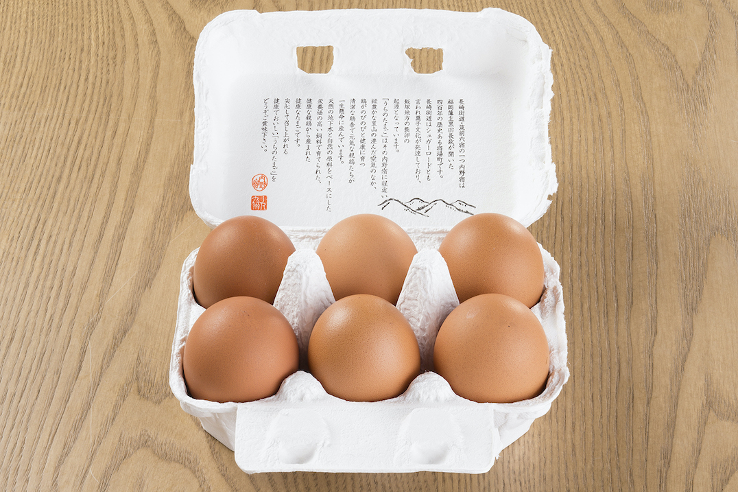 店名の「うちのたまご」とは、福岡県飯塚市の緑豊かな里山にある「内野(うちの)」養鶏場のたまごのこと。澄んだ空気と水に恵まれた環境で、ストレスなくのびのびと育った健康な親どりが産むたまごは、ヘルシーと評判です。