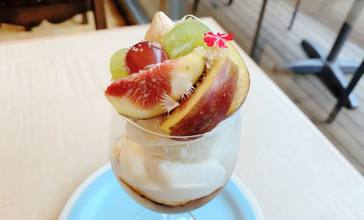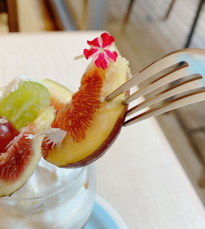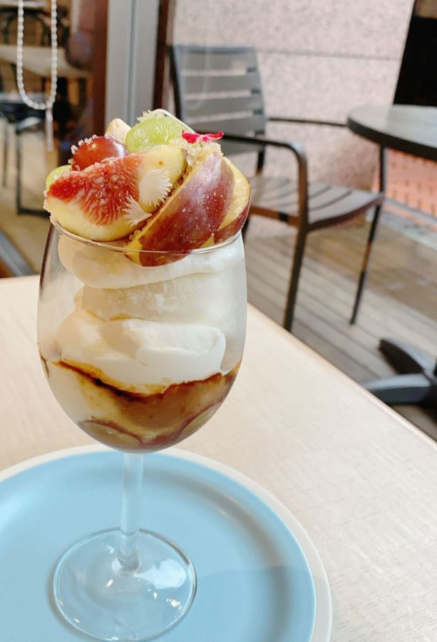 まず注文したのは、このお店の名物である「季節のパフェ」。旬のフルーツを使っているため、季節によってラインナップが替わります。この日は「いちじくとぶどうのパフェ」1200円でした。落ち着いた色彩の、大人かわいいパフェは写真映えもばっちり!