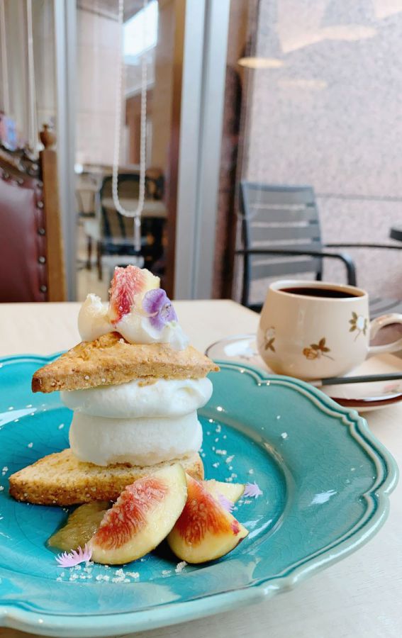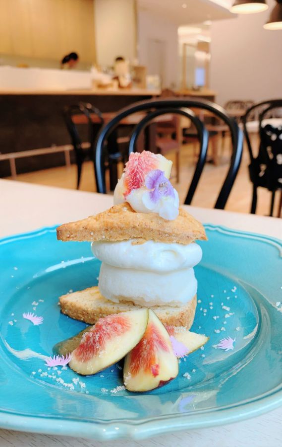 次にご紹介するのは、姉妹店の「コマグラカフェ」でも根強いファンが多いという「もちきび入りビスケット ミルクアイスといちじく」900円。素朴なネーミングからは想像もできないほど、映えるひと品が運ばれてきてびっくり!いちじくとお花の淡い色合いの組合わせがかわいすぎる…!