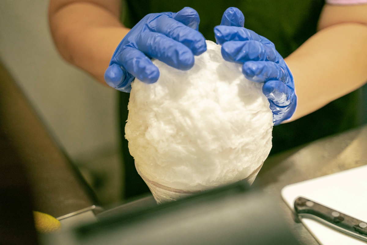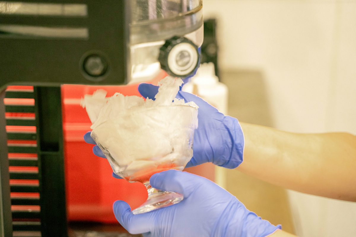 使用する氷は、48時間以上かけてゆっくりと凍らせた純氷。これを溶けるか溶けないかぐらいの絶妙な温度で保管します。氷が冷えすぎないので急いで食べてもキーンとなりにくく、適度な柔らかさとジューシーさも楽しめるのだとか。