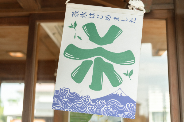 入口には「茶氷(ちゃごおり)」の旗が。茶氷は、静岡県内にあるカフェやお茶問屋で静岡産のお茶を使ったかき氷を食べられるプロジェクト。2021年は71軒が参加していて、丸玉園はその中でも人気のお店です。