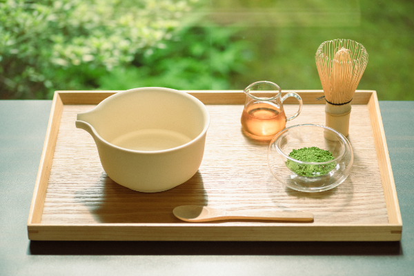 カウンターで注文し席について待っていると、水の入った器と抹茶、カンロ、そして茶道の道具である茶筅(ちゃせん)が運ばれてきます。