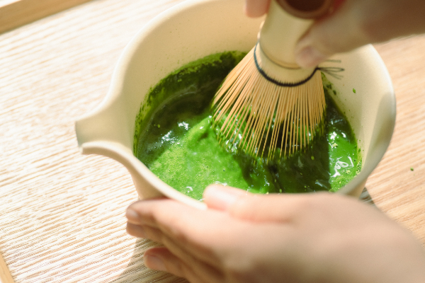 水の中に抹茶をサラサラッと入れ、泡がたつまで「M」の字を描くように茶筅を振ります。