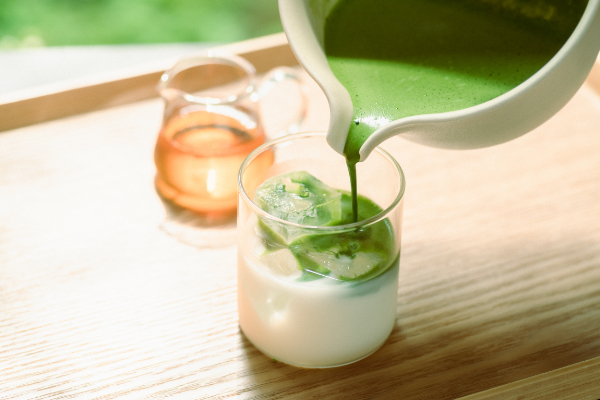 牛乳にできたての抹茶を入れたら、抹茶ラテの完成!抹茶のグリーンと牛乳の白、2色のコントラスが美しい。ゆっくり注ぐことでキレイな二層になります。