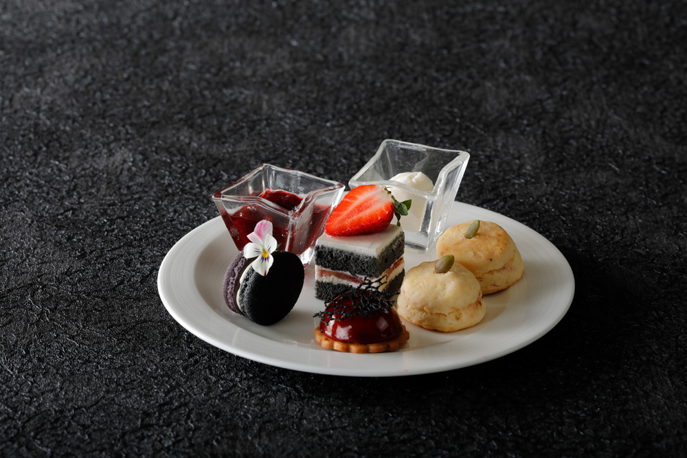 中段には、竹炭といちごを使用した「ショートケーキ」、リンゴの形をしたグリオットチェリーのケーキ「グリオットムース」が並びます。「かぼちゃスコーン」は2種のジャムで楽しんで。