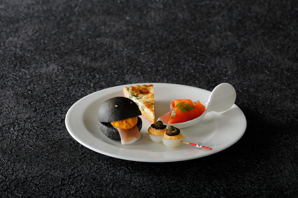 下段は、セイボリーが中心。舌を出したモンスターに扮するのは「かぼちゃと生ハムのバーガー」。「うずら卵のデビルドエッグ 」は小さなウィッチハットがキュート!