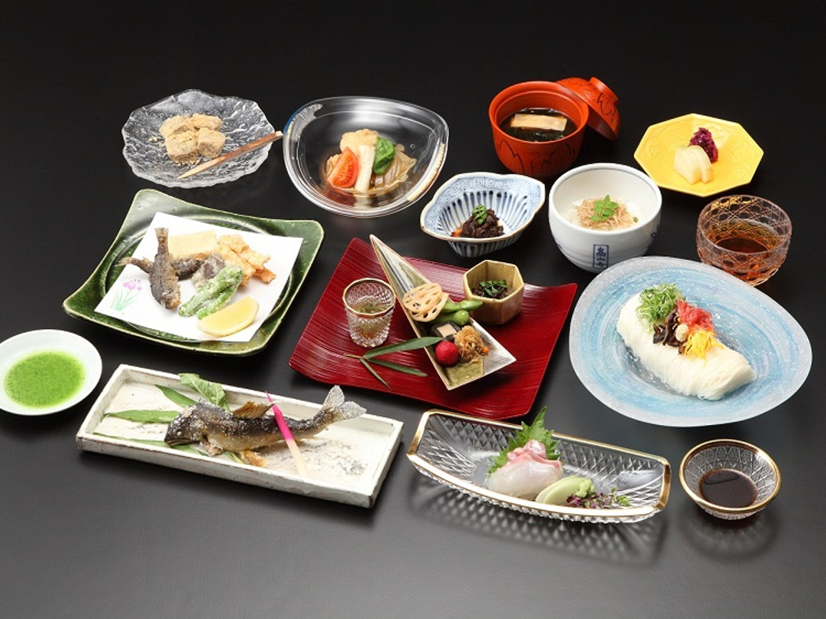 京野菜を中心とした季節の旬野菜は、料理長自らが目利きをして厳選。鮎や岩魚などの川魚はその日の天然物を活きたまま仕入れ、貴船川の生け簀で泳がせているため鮮度は抜群です。食べる直前に揚げるアマゴの天ぷらや貴船の水で泳がせた鮎の塩焼きなど、川魚生簀(いけす)料理がたっぷり楽しめる会席ランチは(8800円)や、鱧しゃぶ付きの贅沢な会席料理(1万6500円/9品)がいただけます。