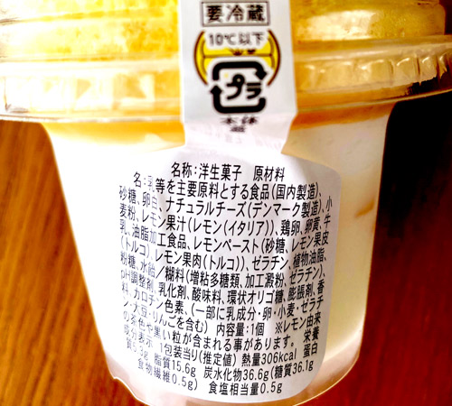 原材料表示を見ると、ナチュラルチーズはデンマーク製造、レモン果汁に使うレモンはイタリア…と、原材料にもかなりのこだわりが垣間見えます。気になるカロリーはというと、カットケーキ1個分くらいの306kcal。