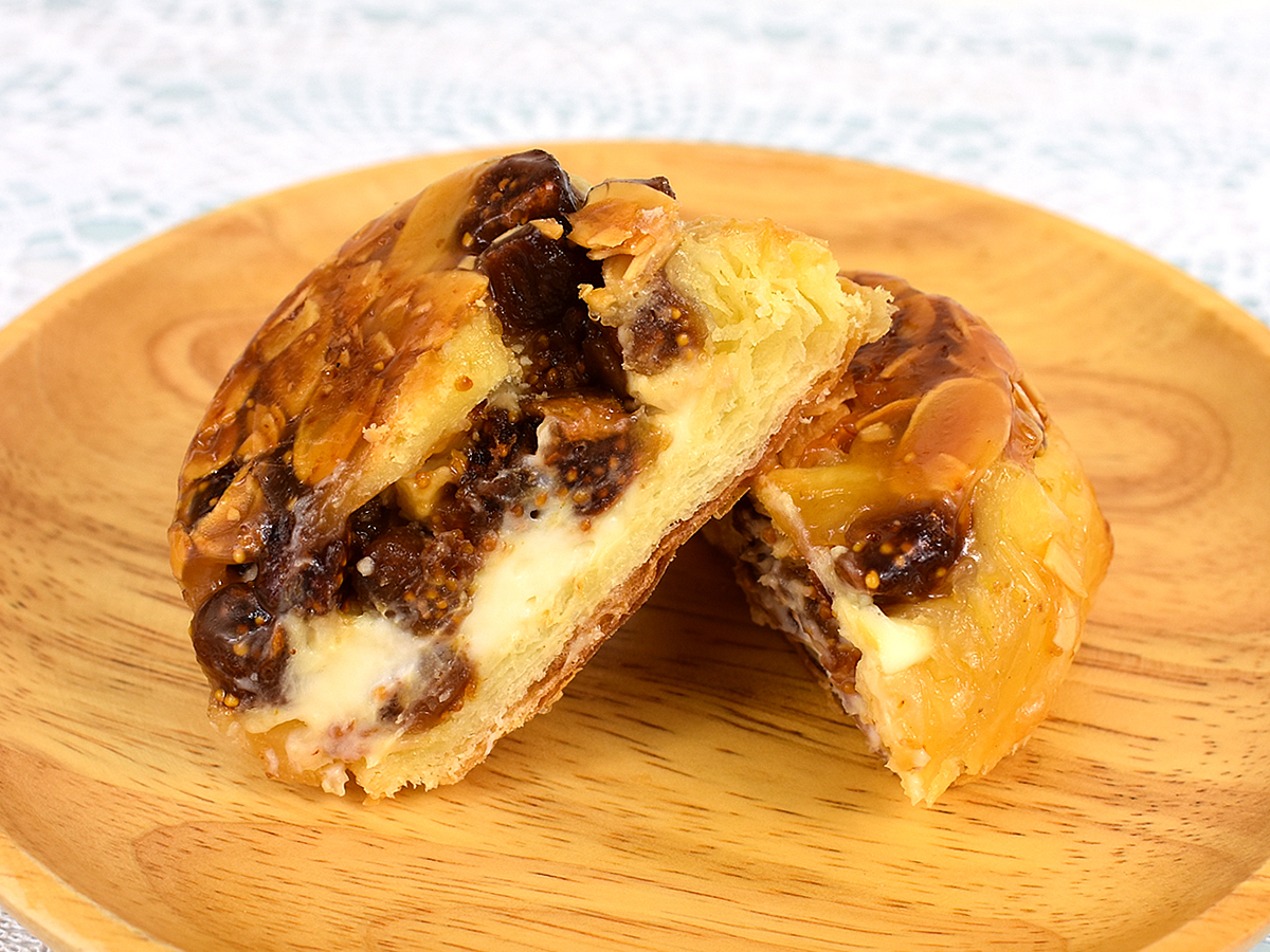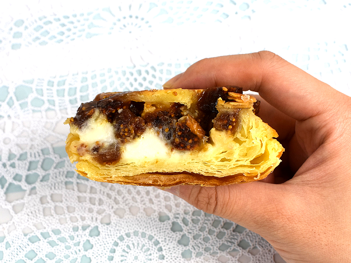 中にはドライいちじくとクリームチーズがたっぷり。ドライいちじくはひとつひとつの存在感が抜群な大きめなカットで、種がぷちっと潰れる食感がアクセントになっています。口の中に上品な甘みが広がり、フルーティーないちじく本来の旨味がじゅわり。なんとも大人っぽい落ち着きのある味わいがたまりません。