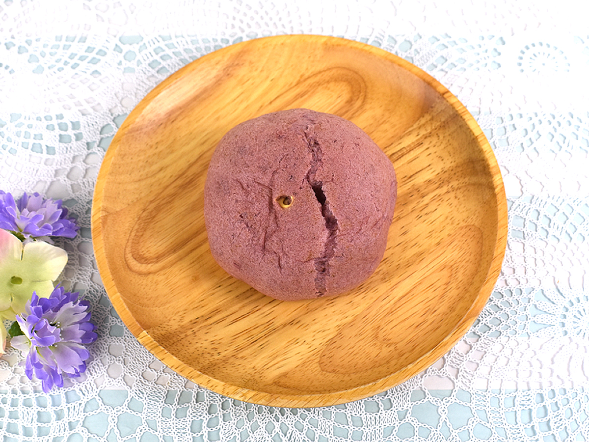 高級感漂う紅色のパッケージを開けてみたところ、紫色のシュークリームがお目見え。丸くてふっくらとしたフォルムもキュートです。手に持ってみると想像以上にずっしりとした重量感。手に吸いつくような触り心地に胸が高鳴ります。