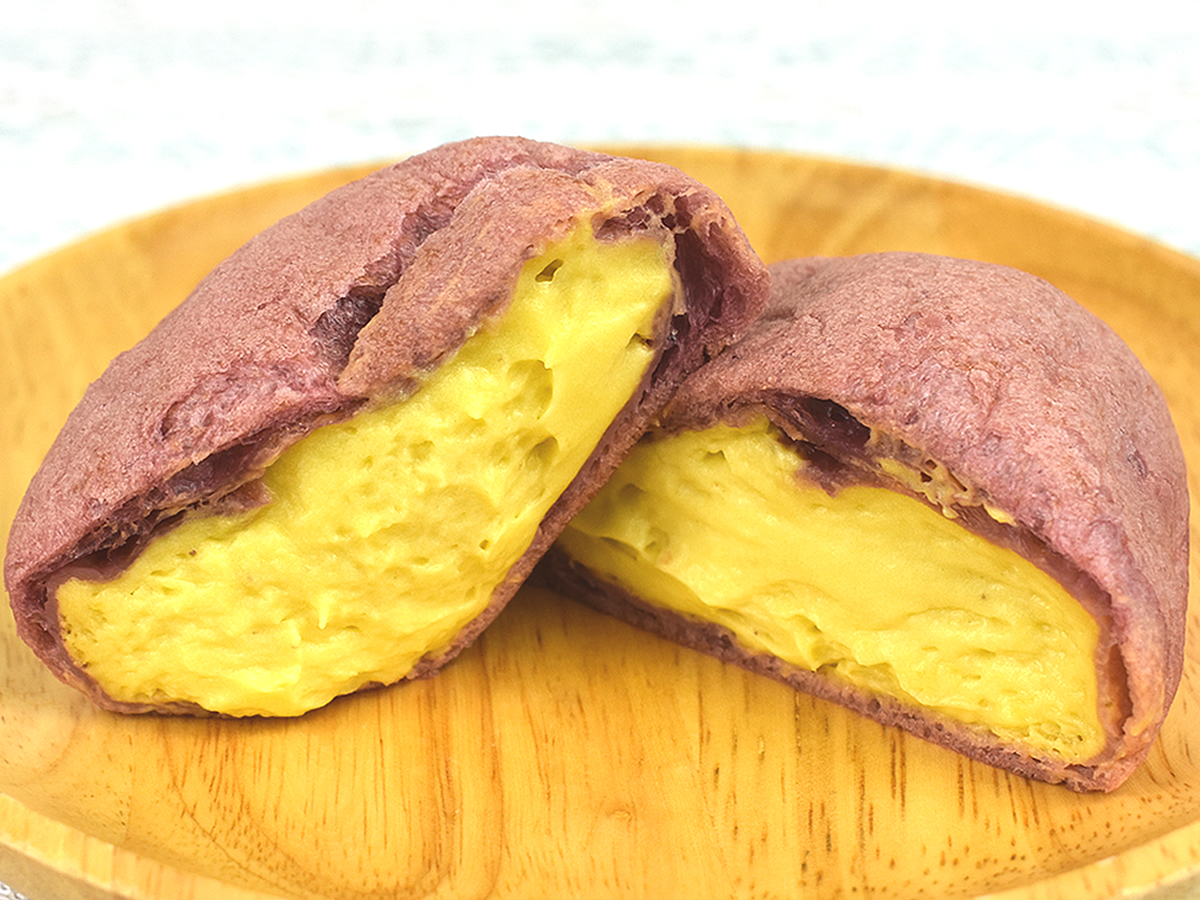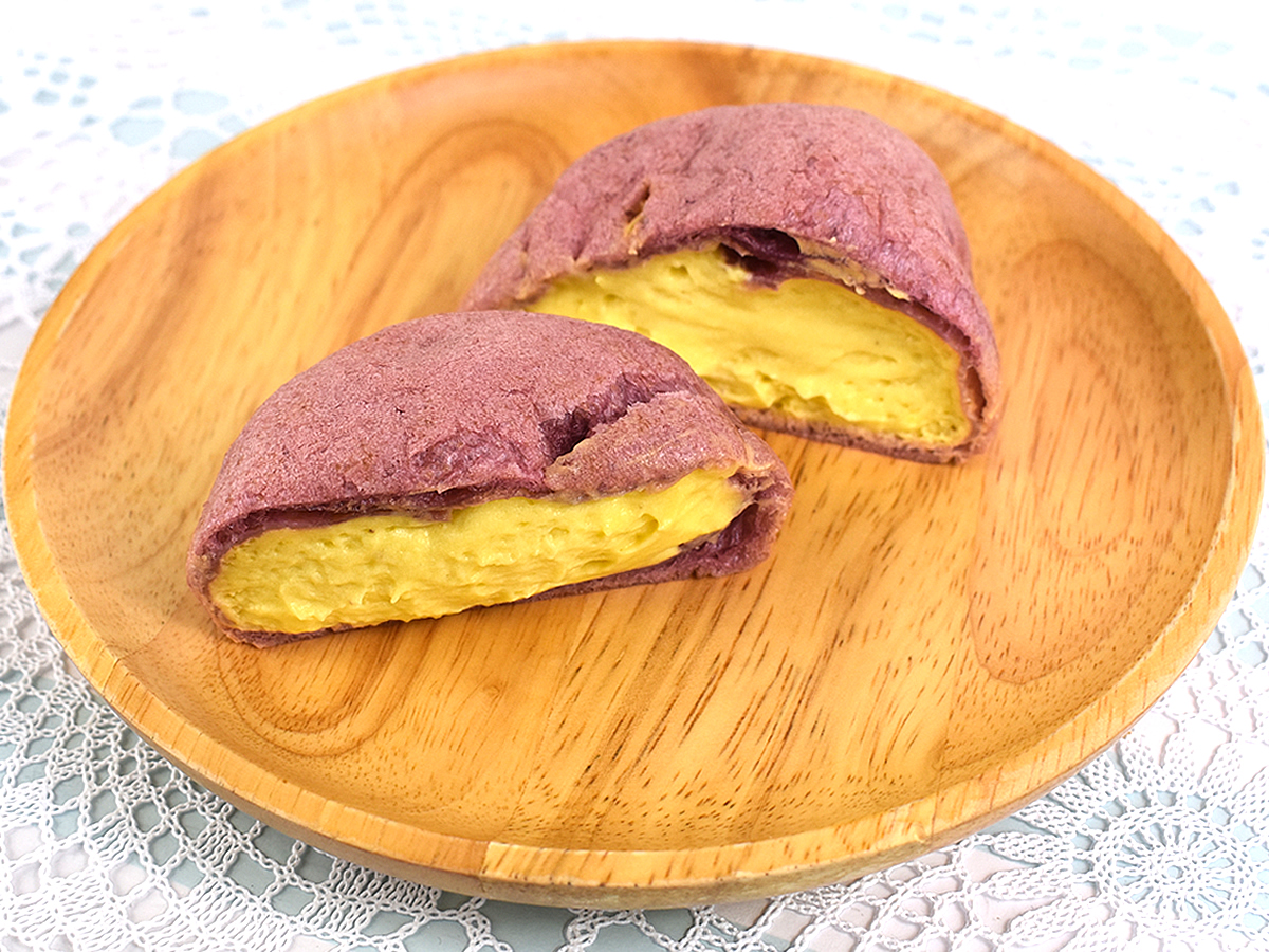 断面を見てわかる通り、クリームは生地の際までみっちり! 優しく掴まないとあふれてしまうので気をつけましょう。紫色のシュー生地×黄色いクリームのコントラストからも「焼きいも感」満載です。