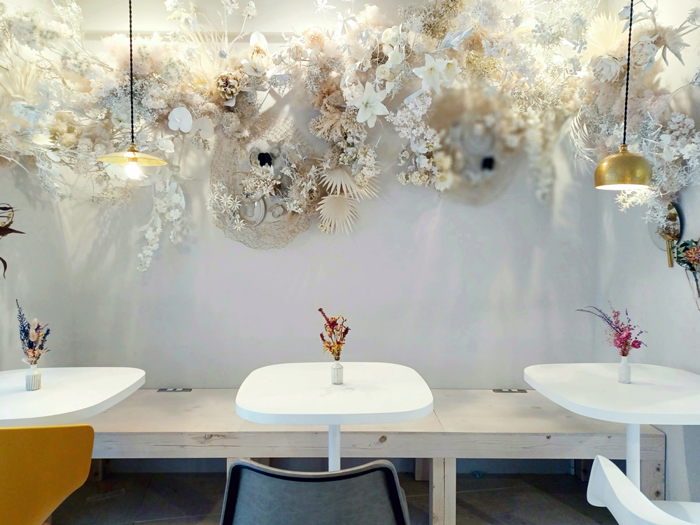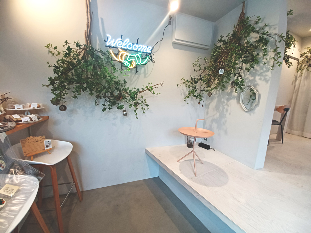 店内のカフェスペースは靴を脱いで利用します。ホワイトカラーのフラワーやインテリア鏡などで彩られた空間は、韓国カフェのようだとSNSで話題です!