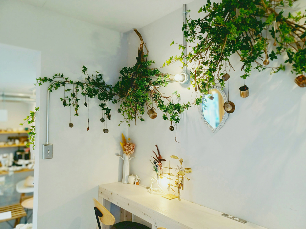 反対の壁は打って変わり、グリーンで彩られたナチュラルテイストの空間。お店の近くにある、北沢川緑道の雰囲気をイメージしたそう。スイーツ製作に使用する道具をバーナーでヴィンテージ加工し、ヘーゼルナッツの木にデコレーション♪
