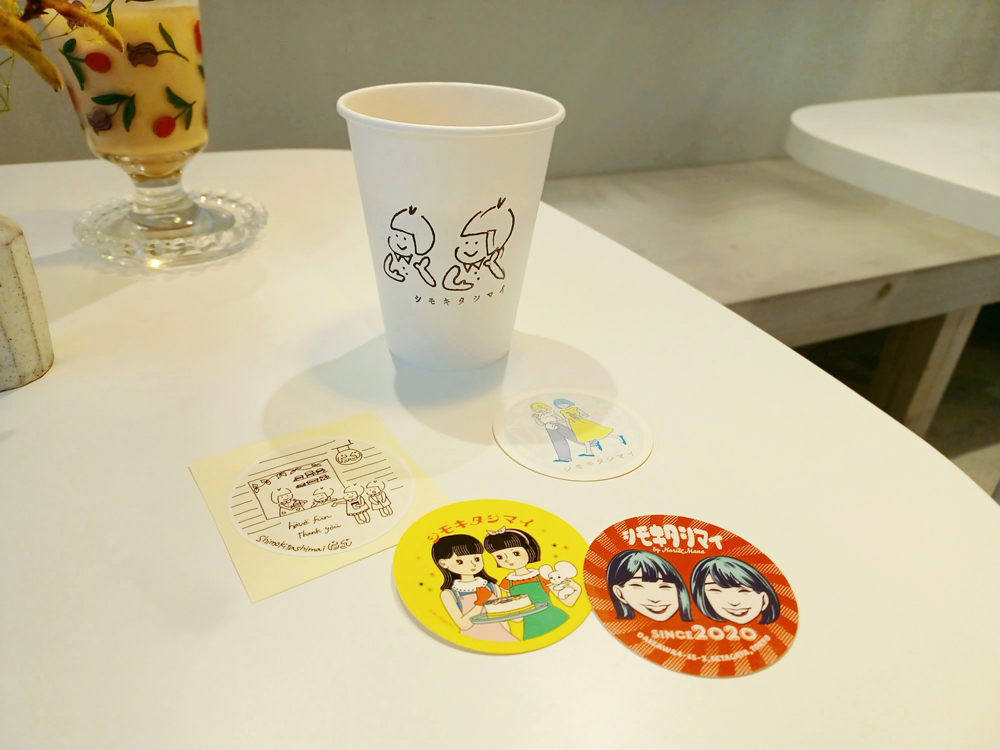 様々なイラストレーターが手がけたかわいいステッカーも販売中。カップや看板に描かれたイラストは、妹さんが手がけたもの!