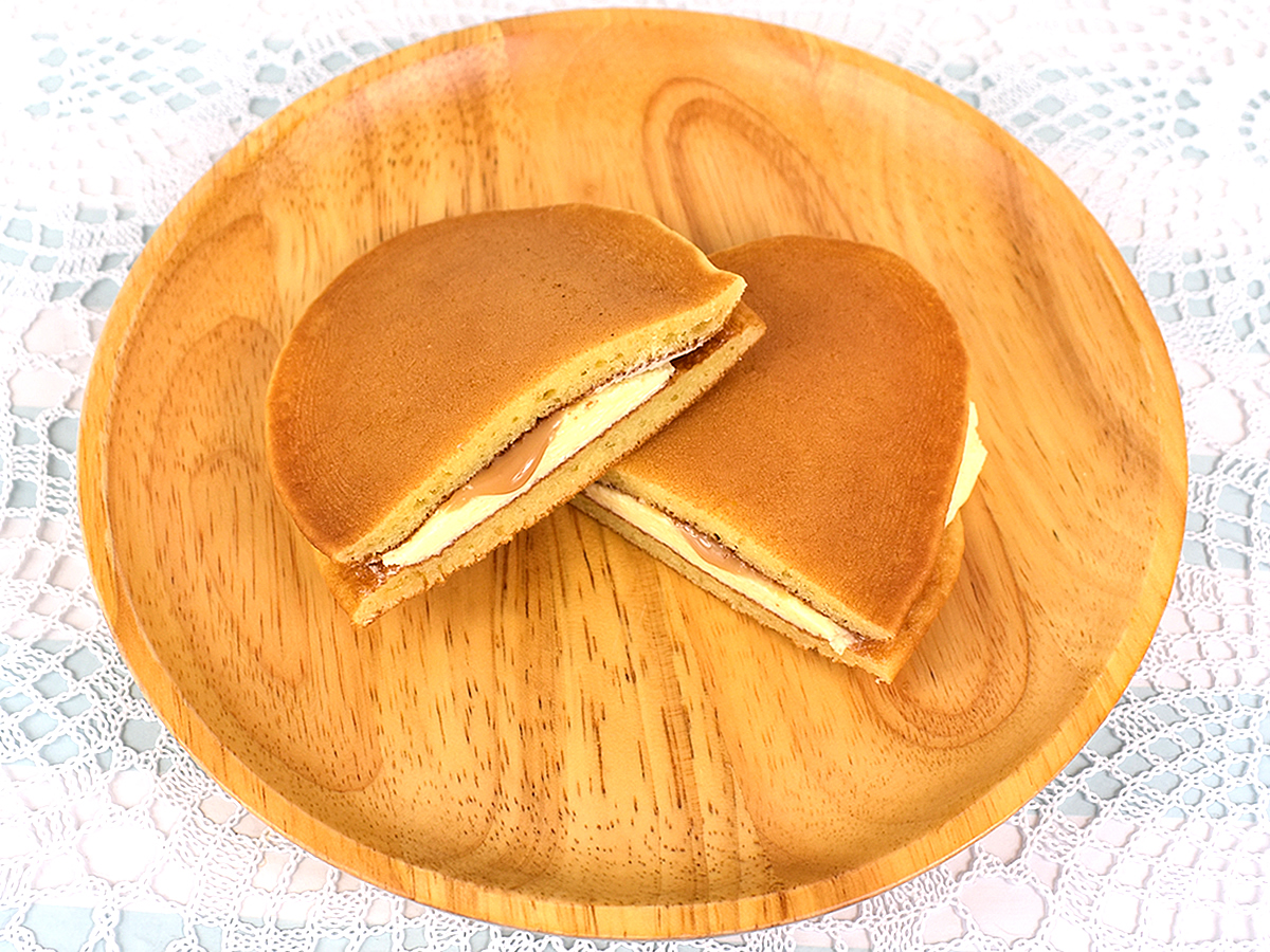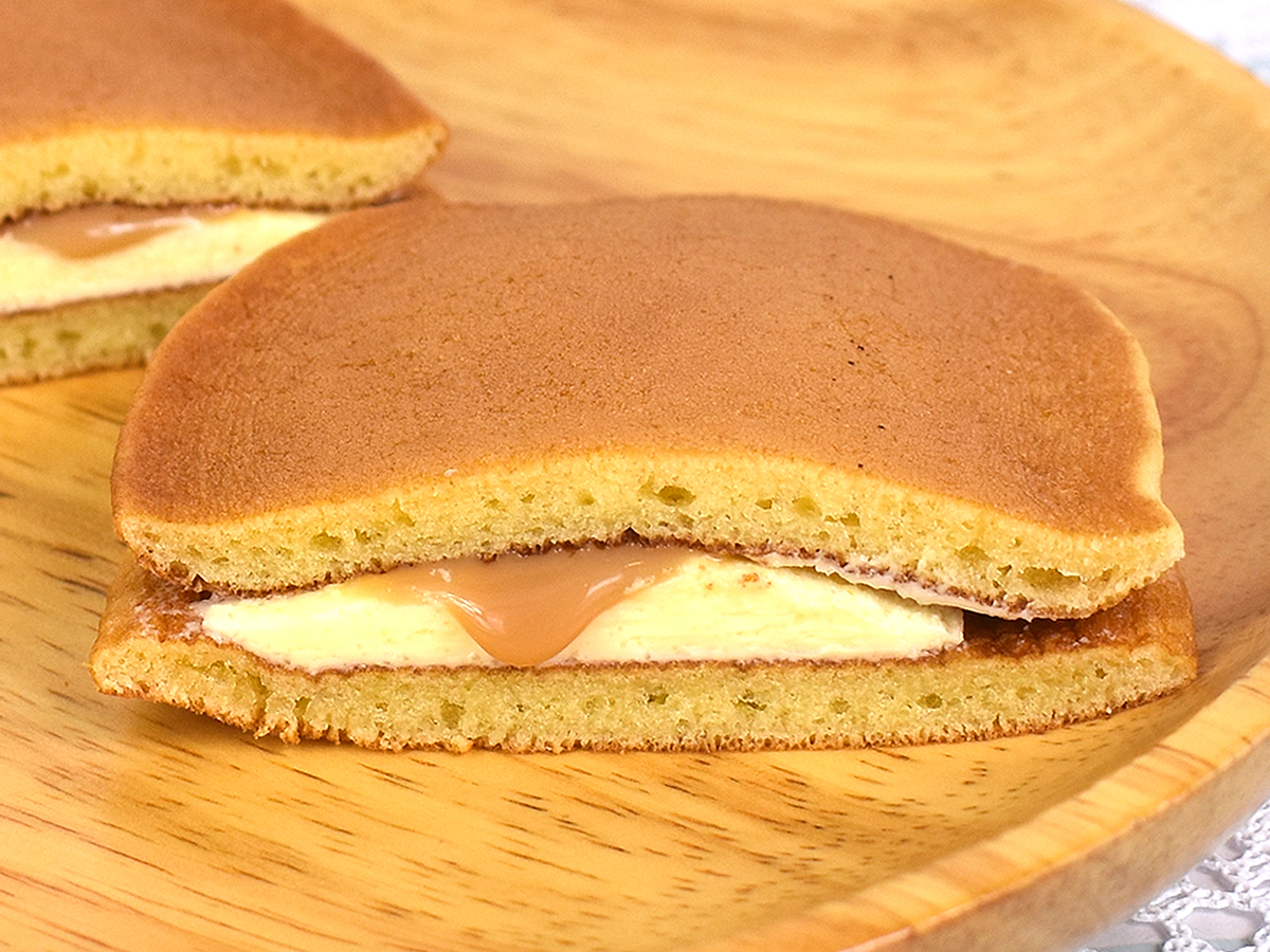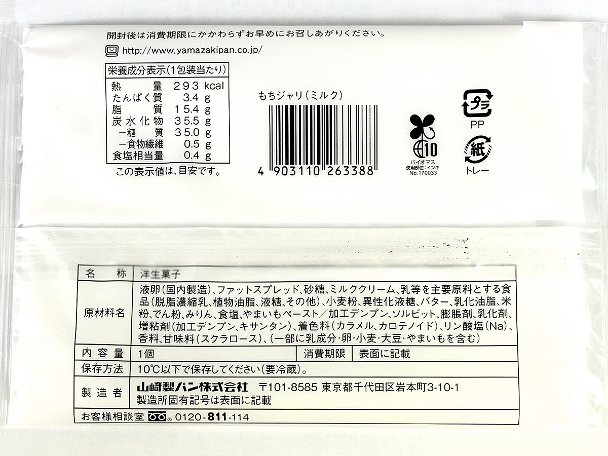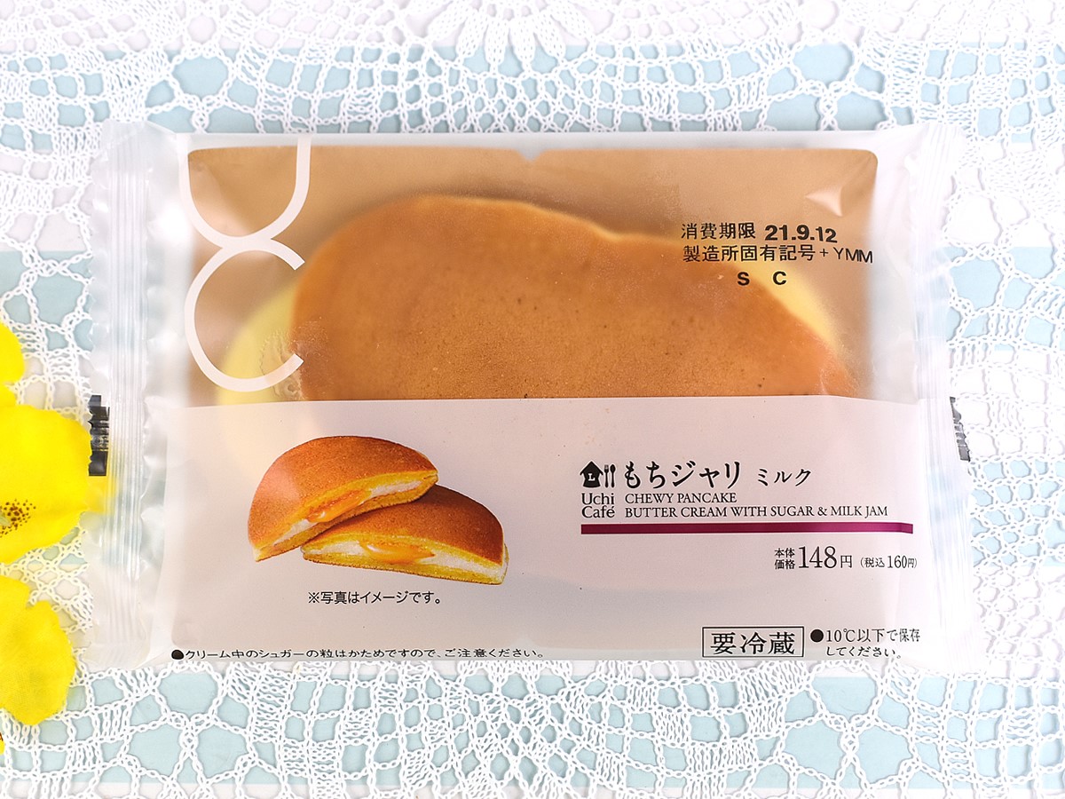 パッケージを開けると、楕円型の「もちジャリ」が登場。2枚の生地の間にクリームがサンドされており、一見どら焼きのようですが、生地が薄いのが特徴です。公式サイトの紹介文には「地味だけどはまっちゃう」との説明が。見た目からは味わいの想像がつかず、ワクワクしてしまいます。