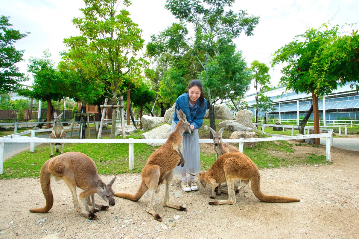 続いては、緑豊かで開放的なアウトサイドパーク(屋外エリア)へ。北側に広がるカンガルーファームには、5~10頭程度のアカカンガルーが元気に跳ね回っています。エサやり体験用のおやつを見せると、ピョンピョン近づいてくる姿がとってもキュート♪