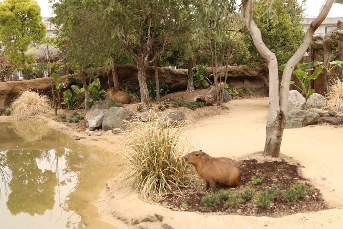 2024年4月にオープンしたばかりのカピバラの新エリア「カピバラたちの湿地〜Pantanal〜」。カピバラの生息地である南米は世界最大級の大湿原Pantanal(パンタナール)をイメージしたエリアで、まさにカピバラの楽園!