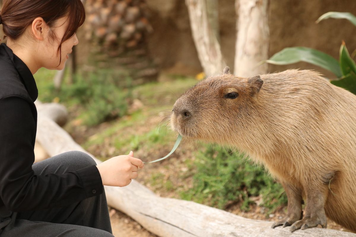 水中から目と耳と鼻だけを出してまったり過ごすカピバラや、木陰で休むカピバラ、仲間同士じゃれ合うカピバラなど、のびのびとした自然体な様子にこちらまで心が緩みます。エサやりもできるので、推しカピバラを見つけてみるのも面白いですよ。