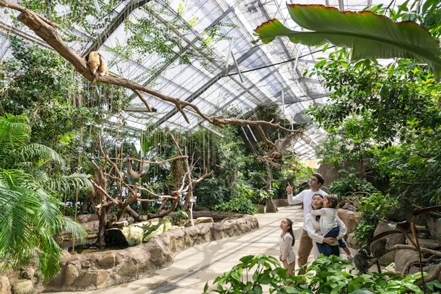 岩場と水辺で構成され、熱帯雨林のジャングルをイメージしたエリア「熱帯の森」では、熱帯の植物と共にさまざまな鳥たちや猿たちとご対面。