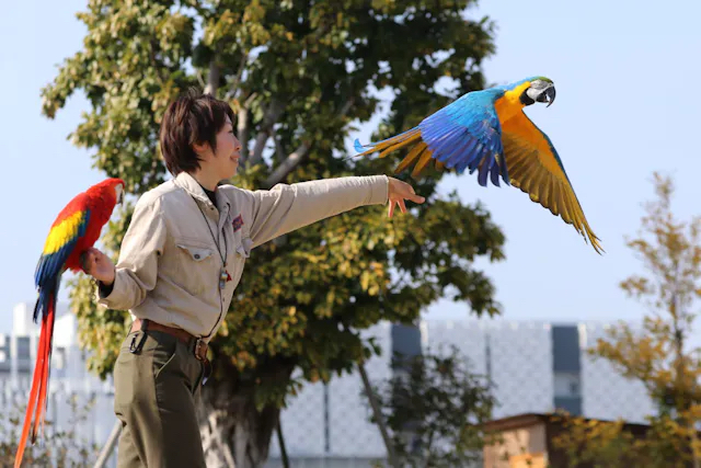 屋外にある「パフォーマンス会場」の「風のスタジアム」では王国がイチオシする2種類のパフォーマンスを見ることができます。 ワシやタカ、インコが大活躍する「Wings(ウィングス) フリーフライトバードパフォーマンス」は王国10周年を迎え、よりダイナミックにリニューアル!大空を自由に飛ぶ雄大な鳥たちの姿に、息をのむこと間違いなしです。
