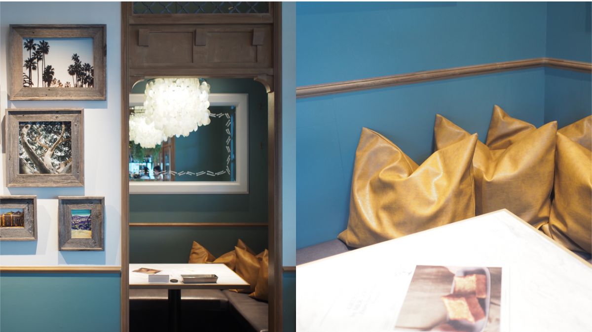 ちょっとした個室のように仕切られたスペースは、女子会やお子さん連れのママ友会にもよさそう!ブルーグリーン×ブラウンのカラーリングもおしゃれです。