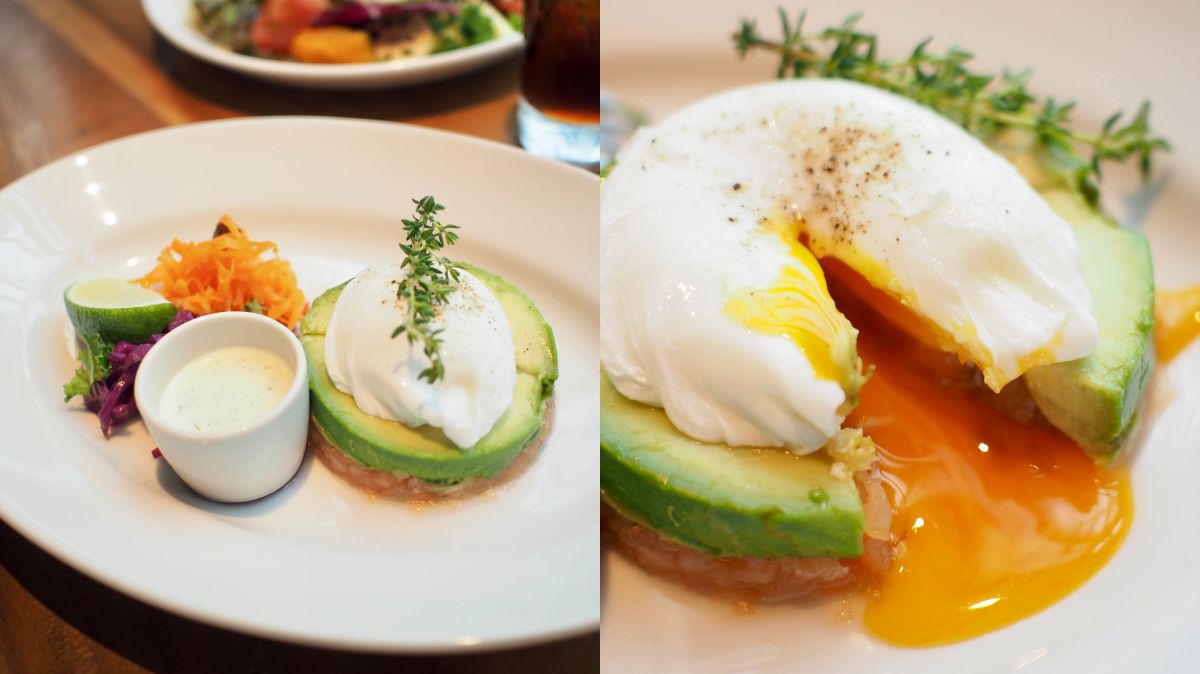 こちらも人気の「サーモンのタルタルとアボカドとポーチドエッグ ディルソース」。ポーチドエッグにナイフを入れた瞬間、食欲をそそる黄身がとろ~り♪サーモンとアボカドの王道の組合わせは、女性からのオーダー率が高いそう。