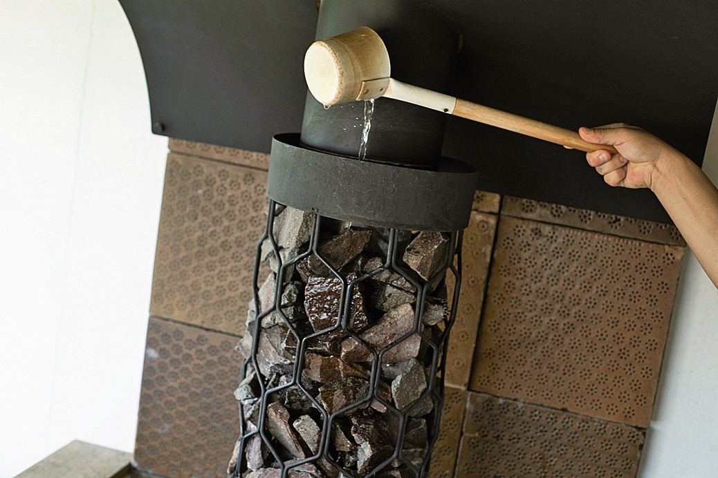 「Sea Sauna Shack」の特注ストーブにロウリュするさまは、まるで滝のよう!低温湿潤&バジルの香りでじっくりと蒸される体験ができますよ。