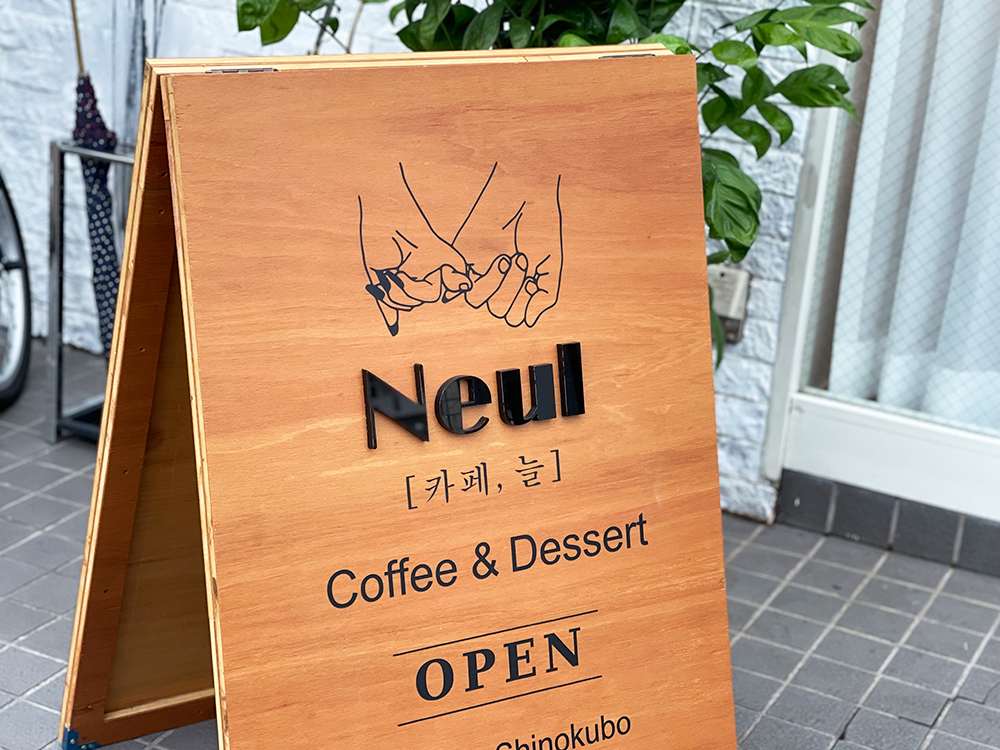 「Neul」はJR新大久保駅から徒歩5分、コリアンタウンの裏路地に位置しています。白いレンガ調のお店の前にはかわいい立て看板が…!