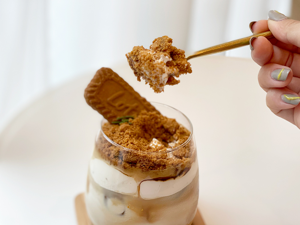 ロータスクッキーを砕いたクランチのザクザクとした食感やカラメルの風味、クリームの甘さ、エスプレッソの苦味が口の中で融合して絶品!隠し味のキャラメルソースの風味も効いています。